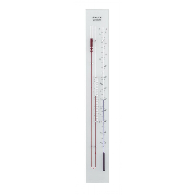 Kapalinový barometr s teploměrem ECOCELLI s volně uchycenými kapilárami, určený k pověšení. Sada k nastavení a fixační materiál přiložen. Celý barometr je vyroben ze skla, kapalina v barometru je zcela bez rtuti...