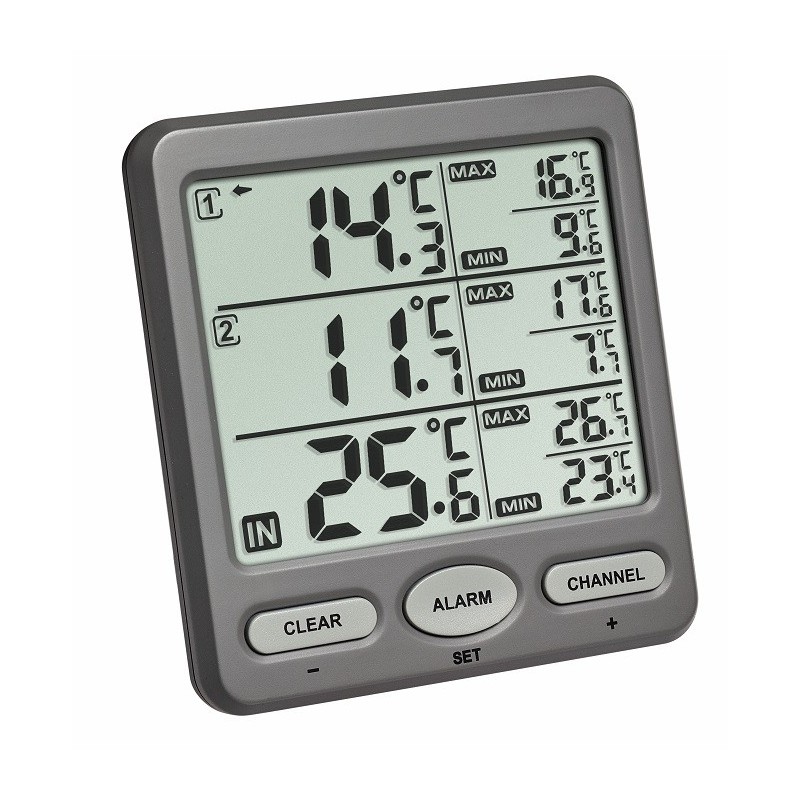 Bezdrátový teploměr TFA 30.3062.10 TRIO je ideálním pomocníkem pro trojité měření teploty. Vnitřním čidlem můžete měřit např. teplotu v pokoji. Pomocí bezdrátového vysílače pak můžete měřit teplotu v další místnosti nebo teplotu venkovní. Druhý vysílač je vybaven voděodolnou kabelovou sondou, takže je možné jej použít i pro měření teploty vzduchu v lednici, mrazáku, teplotu vody v akváriu, bazénu nebo jezírka. Základna umí přijímat až 8 různých bezdrátových čidel. Na přijímači je možné nastavit teplotní alarmy, nechybí paměť pro uložení min./max. hodnot od doby posledního vyresetování.