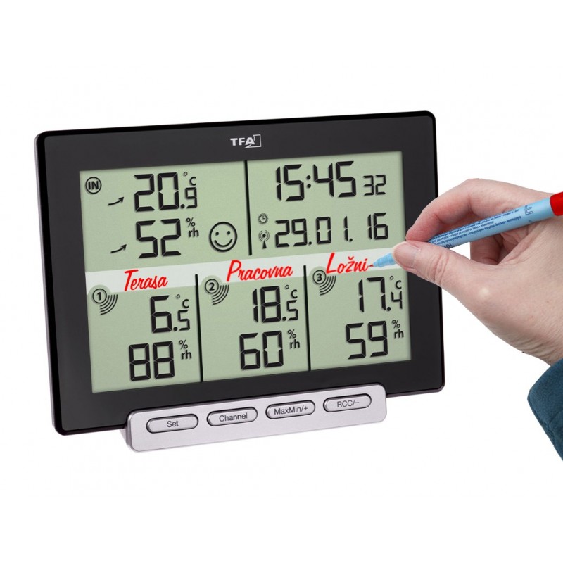 Pro toho, kdo potřebuje monitorovat teplotu na více místech je TFA 30.3057.01 MULTI SENS naprosto ideální zařízení. Teplota a vlhkost z čidla je díky bezdrátovému signálu (dosah až 80 m ve volném prostranství) přijímána základnou s displejem, která má též zabudovaný senzor teploty a vlhkosti. Na displeji má uživatel možnost vidět v jednom časovém okamžiku ihned a bez přepínání aktuální hodnoty ze 4 míst. Pro lepší orientaci, kde je konkrétní čidlo instalováno, je možné si čidla popsat.