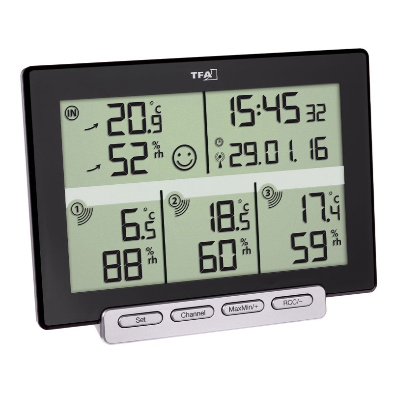 Součástí přístroje jsou již v základní výbavě 3 čidla (TFA 30.3221.02). Přístroj nadále disponuje funkcemi jako je paměť na minimální/maximální naměřené veličiny, symbolová indikace vlhkostní pohody (sucho, komfort, vlhko) a vývoje vnitřní teploty/vlhkosti (klesá, stoupá, nemění se).