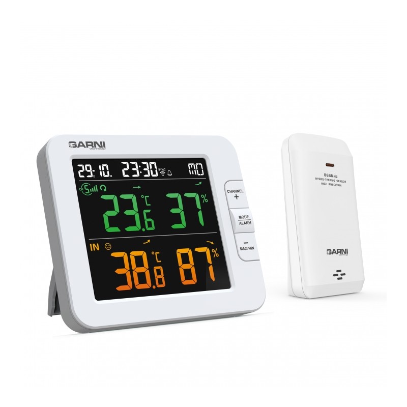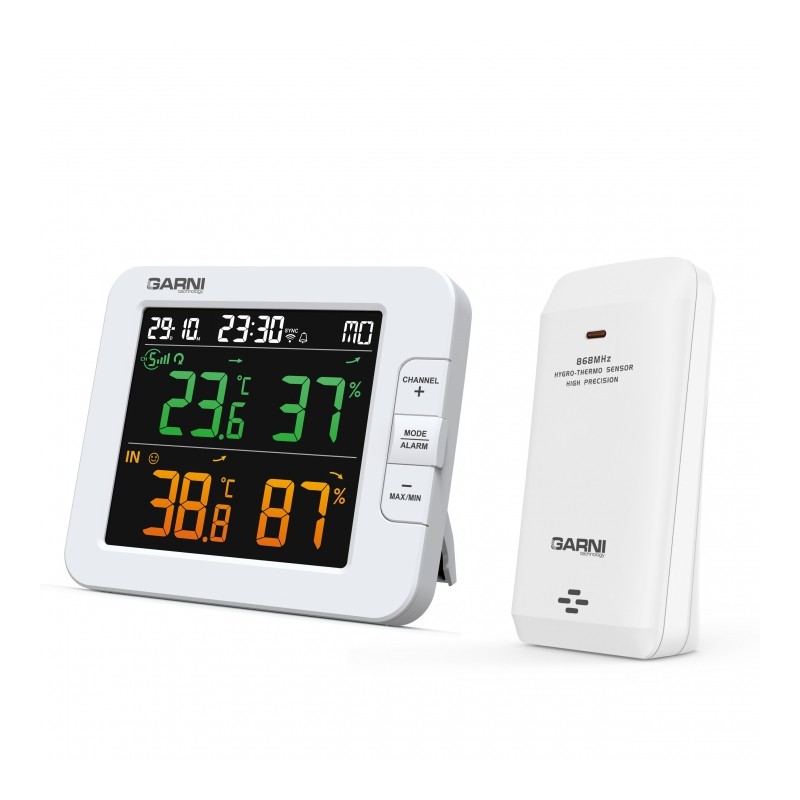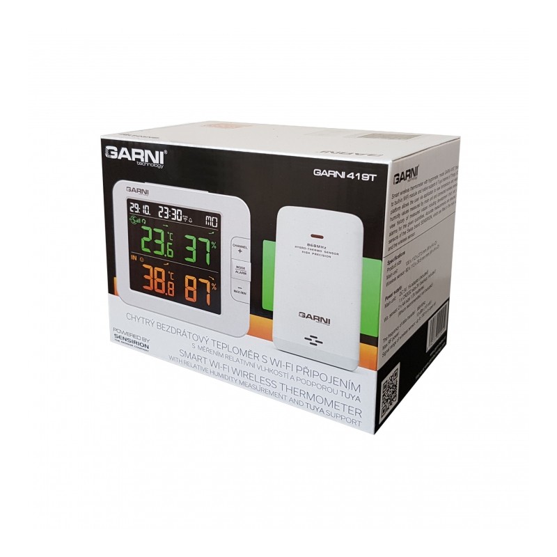 Chytrý vícekanálový teploměr s vlhkoměrem, model GARNI 419T má vestavěný modul WiFi a prostřednictvím svého chytrého systému je kompatibilní s platformou Tuya IOT. Pomocí aplikace Tuya Smart můžete sledovat teplotu a relativní vlhkost hlavní jednotky a bezdrátových čidel, kontrolovat historii záznamů, nastavovat alarmy pro dané veličiny, spouštět pokročilé funkce za pomocí naměřených hodnot a naměřená data odeslat na email v Excel souboru. Je možné jej propojit s dalšími produkty chytré domácnosti, ovládání pak probíhá přes aplikaci v mobilním zařízení. Hlavní jednotka i bezdrátové čidlo jsou osazeny švýcarskými čidly SENSIRION.