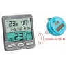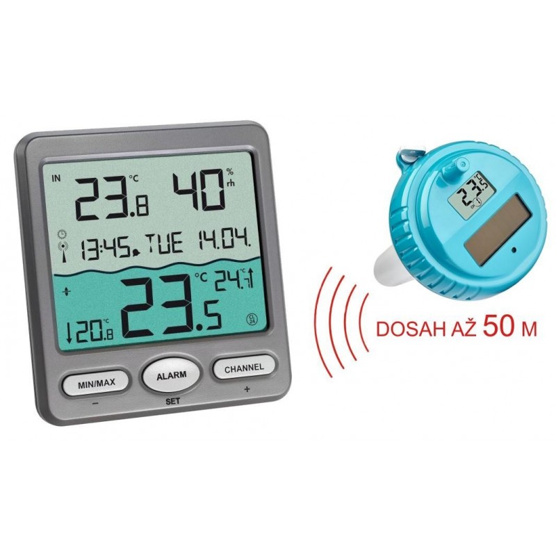 Bezdrátový bazénový teploměr TFA 30.3056.10 Venice je vhodný k měření teploty vody v jezírcích a bazénech - tu měří pomocí bezdrátového voděodolného čidla, které má dosah max. 50 m, jehož součástí je 180 mm dlouhá sonda a také solární panel. Přístroj dále disponuje zobrazením vnitřní teploty a vlhkosti, nastavitelnými teplotními alarmy, funkcí max/min a rádiově řízeným časem a datem. Skvělou vlastností je také možnost rozšíření až o 7 bezdrátovým čidel teploty/vlhkosti, které mají dosah až 100 ve volném prostoru (ty nejsou součástí balení).