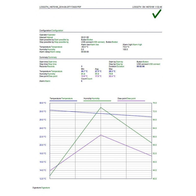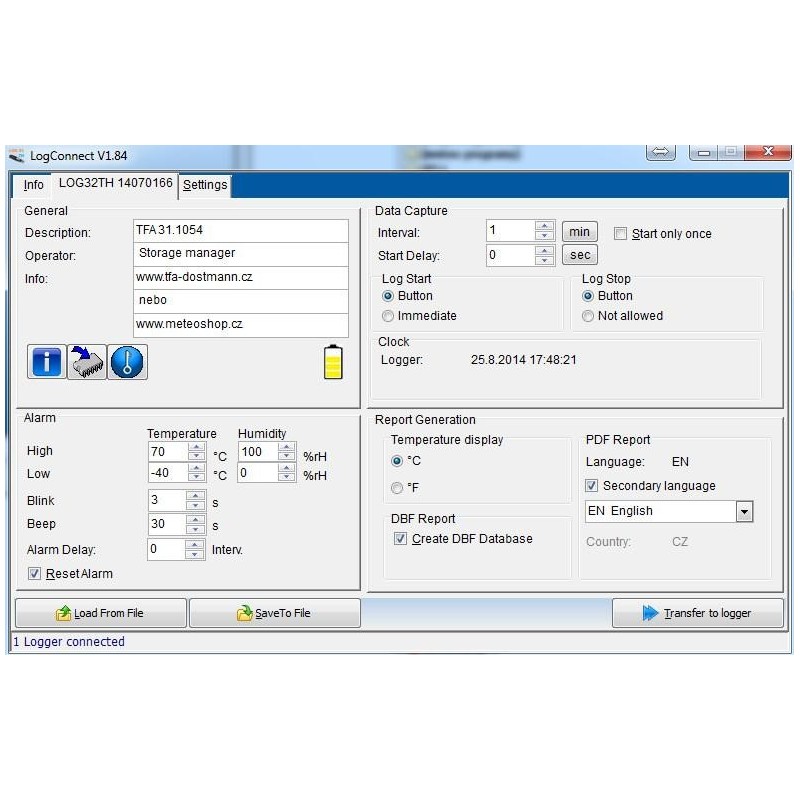 Datalogger TFA 31.1054 LOG32 TH je miniaturní zařízení, jenž měří teplotu a vlhkost v různě nastavitelném intervalu. Je schopné uložit až 60000 naměřených dat a tyto data lze dále zpracovávat v PC, neboť datalogger je možno připojit přes USB port do jakéhokoliv počítače vybaveného OS Windows XP/Vista/7/8 (32 a 64 bit). Zařízení je možné používat i bez nastavení na PC. Na konci měření přístroj sám vygeneruje PDF dokument - protokol zaznamenanými údaji (pokud si předem nastavíte, tak lze i alternativně DBF soubor se všemi údaji). Ideální použití je pro kontrolu vlhkosti a teploty skleníků, dopravních prostředků pro přepravu jídla, leteckých kabin, chladících automobilů, kontejnerů, muzeí, atd.