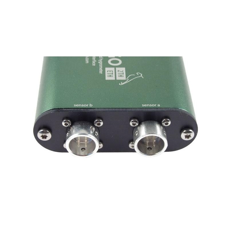Ethernetové rozhraní s PoE napájením pro dva sdružené senzory. Měří jen teplotu nebo teplotu, vlhkost a rosný bod. Teploty měří v rozsahu až od -55 do +125 °C.