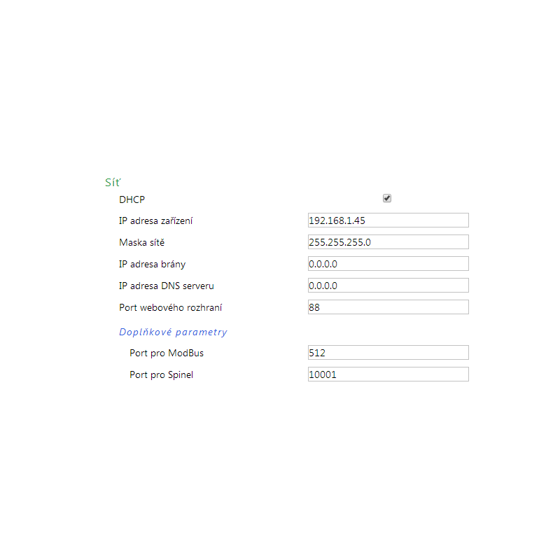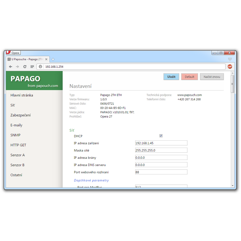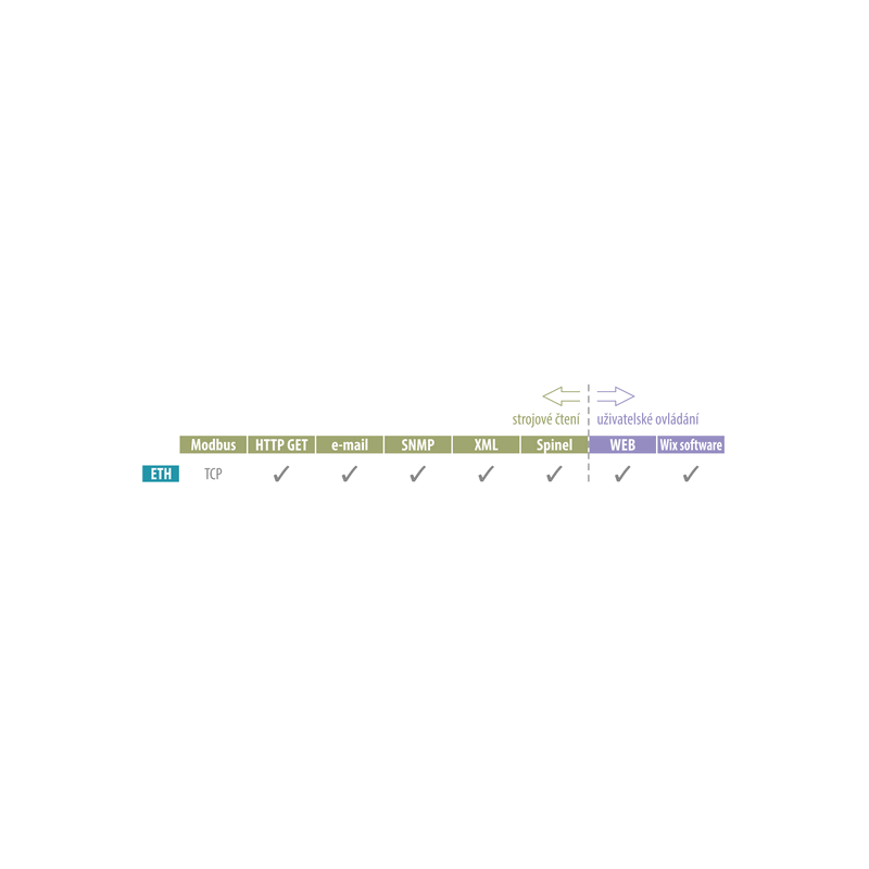 - Ethernetové rozhraní, interní webové stránky (v češtině a angličtině) a mnoho standardních komunikačních protokolů.