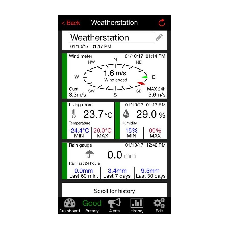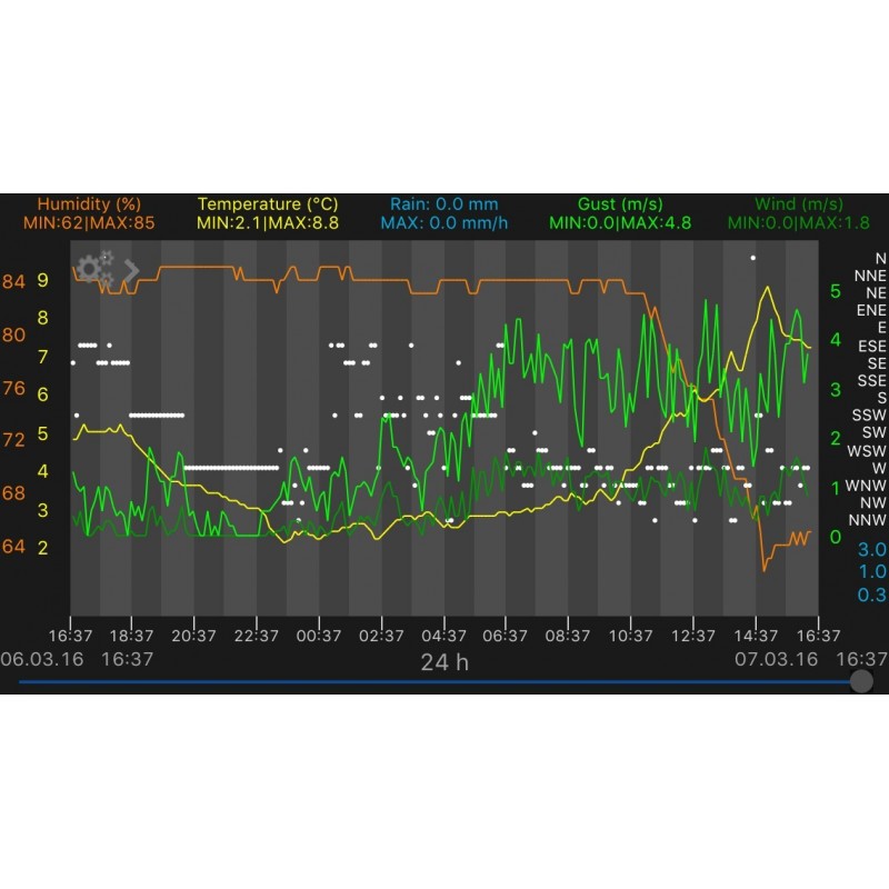 Přehledná a bezplatná aplikace pro tablet či chytrý telefon (Android, iOS) vám umožní kromě sledování aktuálních povětrnostních podmínek také nastavit alarmy měřených veličin a zobrazit historii měření za posledních 90 dní.