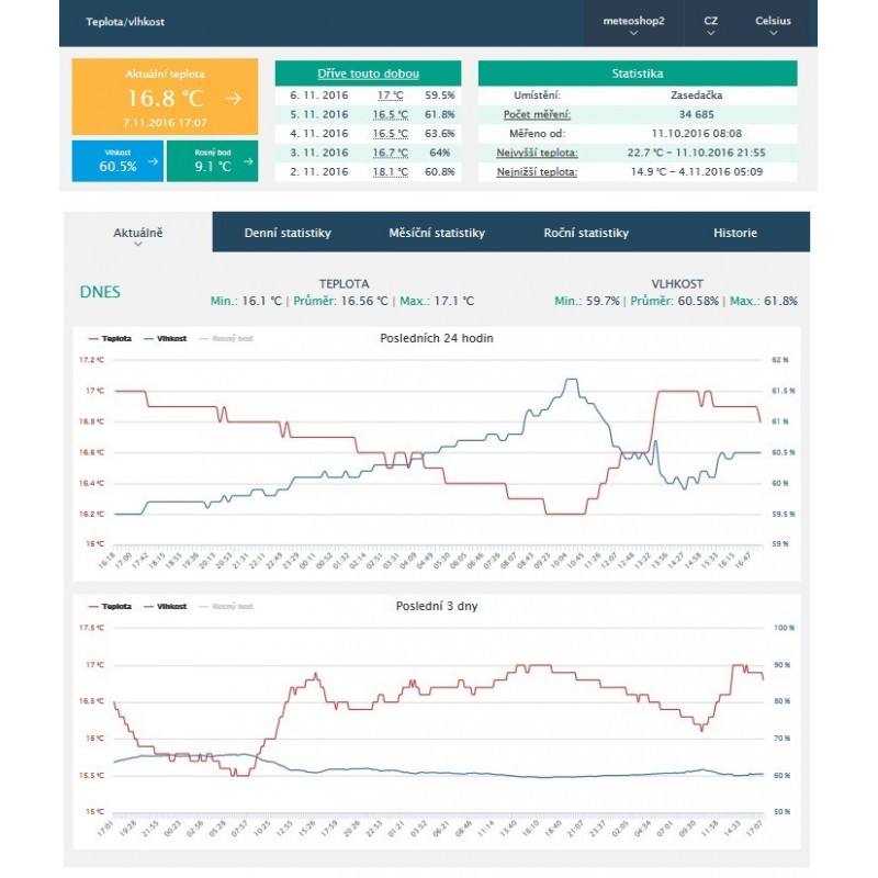 Každé čidlo má unikátní identifikátor (číslo), kterým si ho přiřadíte ke svému účtu na cloudu TMEP.cz. Teploměr každou minutu pošle naměřenou hodnotu teploty (příp. vlhkosti), cloud hodnotu uloží a zpracuje do vaší přehledové stránky. Na vlastní adrese máte detailní přehled všech naměřených hodnot včetně propracovaných grafů. Naměřená data můžete kdykoliv zálohovat a uložit.