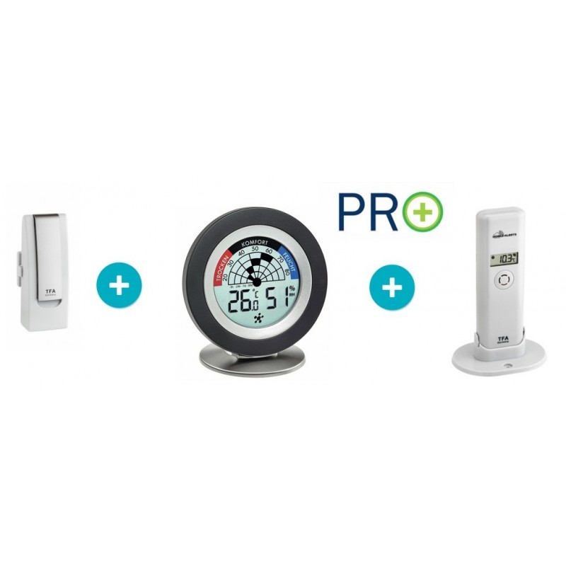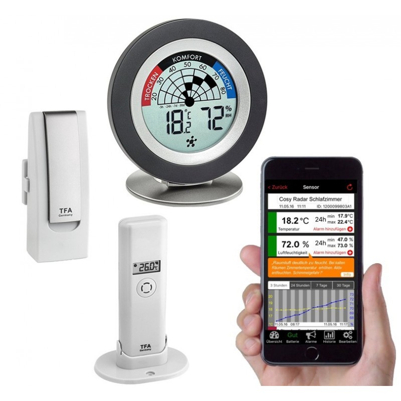 TFA 31.4008.02 WEATHERHUB – set č. 8 – brána, vnitřní teploměr/vlhkoměr, čidlo teploty a vlhkosti – perfektní sada pro ty, kteří chtějí žít zdravě a hlídat si doma ideální klima, tj. správnou teplotu a vlhkosti, prevence proti plísním a suchému ovzduší, aplikace dává tipy kdy větrat atd.