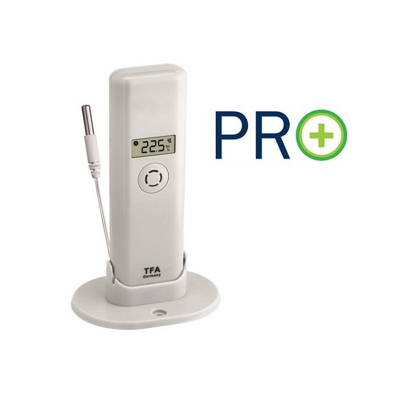 Bezdrátové čidlo pro kontrolu vnitřní nebo venkovní teploty 30.3313.02 ve verzi PRO disponuje vodotěsným kabelovým senzorem pro kontrolu teploty v bazénu, jezírku, lednici, mrazáku nebo třeba akváriu.