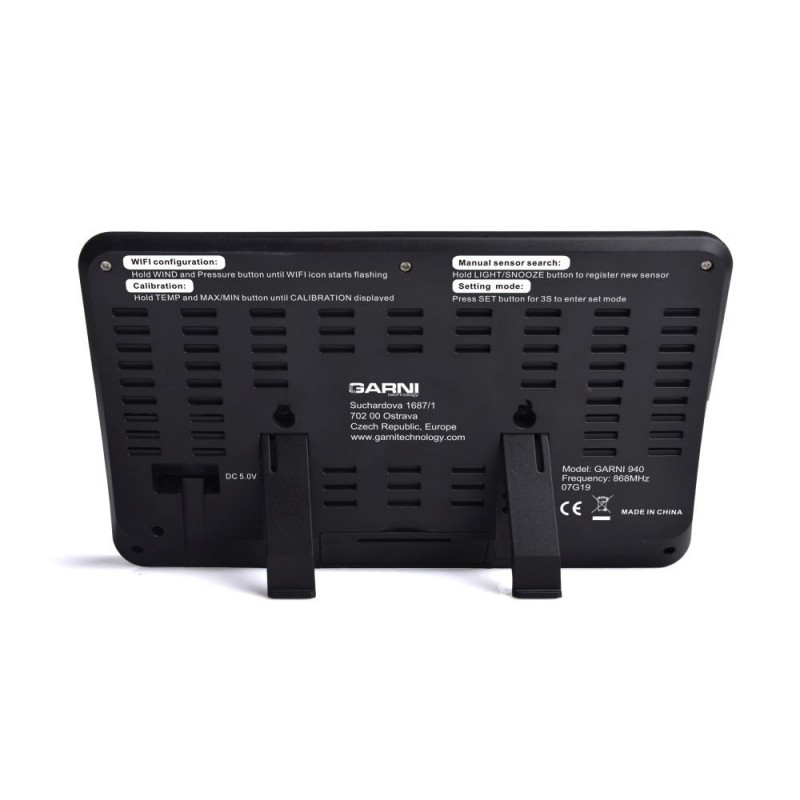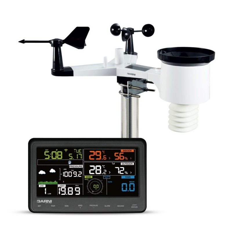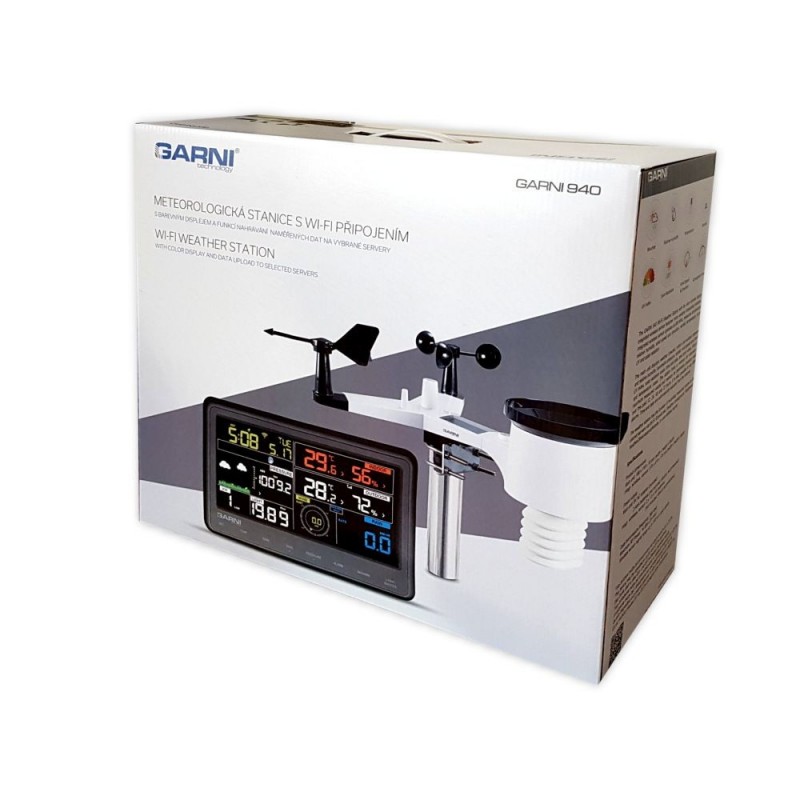 Wi-Fi meteorologická stanice s integrovaným bezdrátovým čidlem model GARNI 940 je vybavena mnoha funkcemi, zajišťujícími informace o předpovědi počasí. Integrované bezdrátové čidlo pracuje na frekvenci 868 MHz a měří teplotu a relativní vlhkost, rychlost a směr větru, úhrn srážek, UV záření a intenzitu osvětlení.