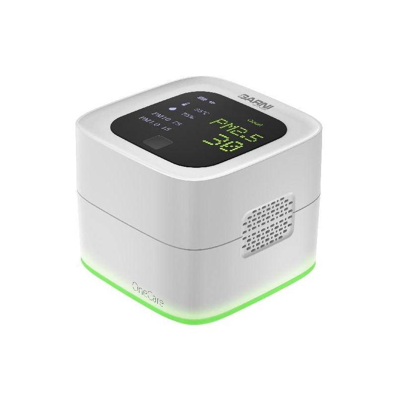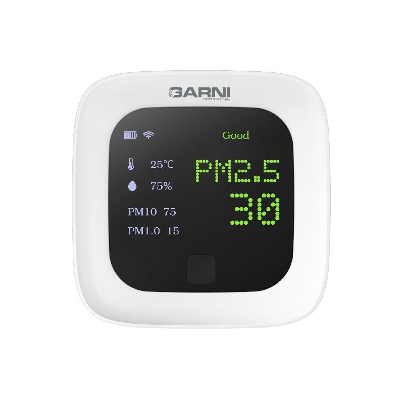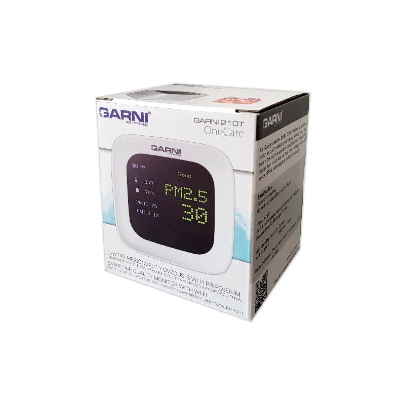 Chytrý měřič kvality vzduchu GARNI 210T OneCare s WiFi modulem měří a zobrazuje na svém barevném TFT LCD displeji naměřené hodnoty kvality vzduchu, teplotu a relativní vlhkost ve vnitřních prostorách. Je kompatibilní s platformou chytré domácnosti Tuya IOT. Umožňuje nahrávat naměřené hodnoty online, zobrazovat je v aplikaci Tuya Smart a prostřednictvím této aplikace automaticky spouštět jiná zařízení. Pro měření pevných částic (PM), teploty a relativní vlhkosti jsou použita švýcarská čidla SENSIRION.