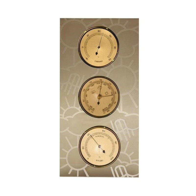 Vnitřní meteostanice s velmi vysokou dekorativní hodnotou. Meteostanice je vybavená teploměrem, vlhkoměrem i barometrem o průměru 85 mm. Jedná se o velmi populární typ výrobku. Podložka je ze skla s motivem počasí.