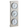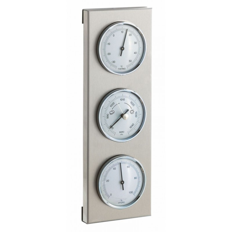 Analogová meteostanice z nerezové oceli s bílými ciferníky pro vnitřní i venkovní použití.