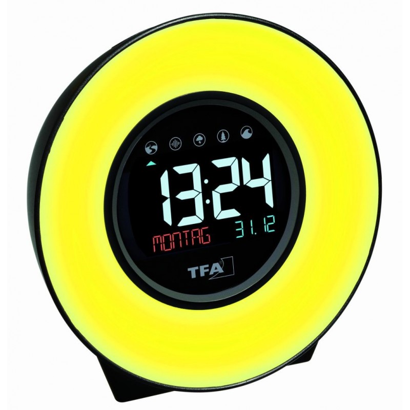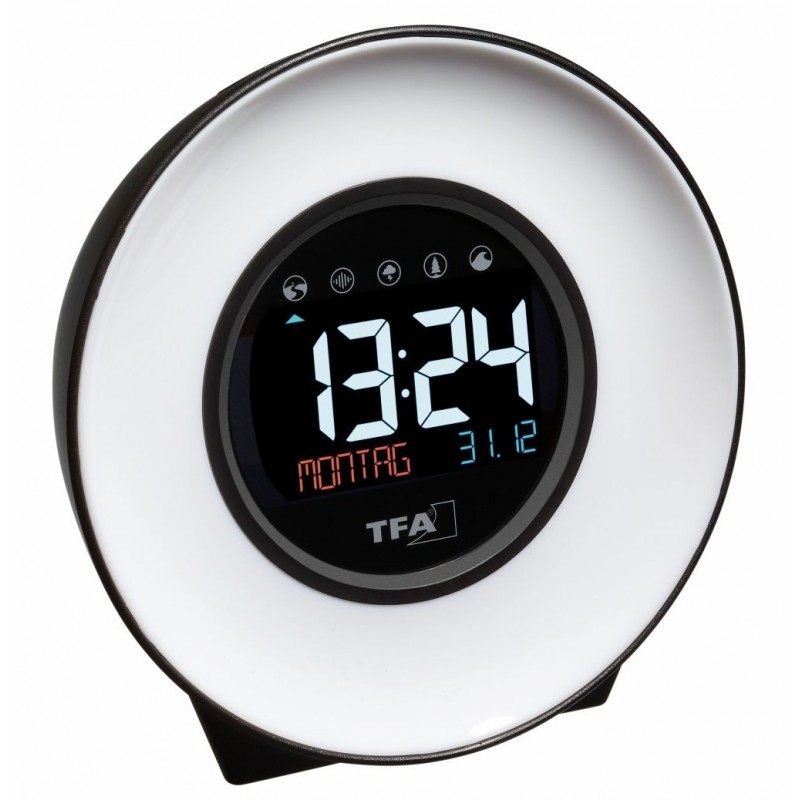 Zahoďte svůj starý budík a pořiďte si moderní přístroj TFA MOOD LIGHT, se kterým se vám bude vstávat jedna radost. Budík nabízí buzení pomocí zvuků přírody také možnost postupného buzení pomocí světla, které imituje sluneční paprsky. Proces probuzení je tak pozvolný a hlavně zcela přirozený. Kromě toho přístroj nabízí další funkce jako zvuky pro usnutí, možnost nabíjení mobilních přístrojů nebo časovač přestávky.