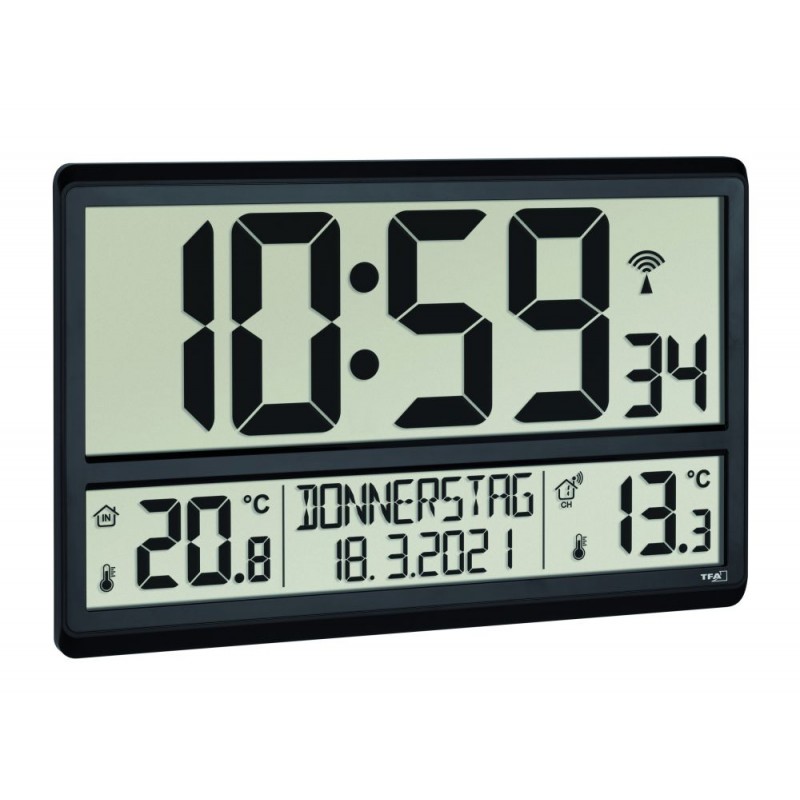 Nástěnné hodiny TFA 60.4521.01 jsou vhodné do každé kanceláře, čekárny, recepce či do jiných větších prostorů. Velký a vysoce přehledný displej je snadno čitelný i z větší vzdálenosti. K orientaci v čase napomůže i zobrazení názvu dne dne v týdnu (vybrat si můžete z 8 světových jazyků) a plně zobrazené datum. Přesný radiem řízený čas se zobrazuje pomocí zvlášť velkých číslic, díky signálu DCF hodiny umožňují i automatické přeřízení letního a zimního času. Nadstandardní vlastností těchto hodin je zobrazení vnitřní a vnější teploty. Vnější teplota se měří bezdrátovým senzorem, maximální dosah čidla je 100 m v otevřeném prostoru. Jednoduchý a čistý design se hodí do každého prostředí a hodiny lze zavěsit na stěnu nebo položit na podložku. Navíc mají hodiny i budík s možností odloženého buzení (snooze).
