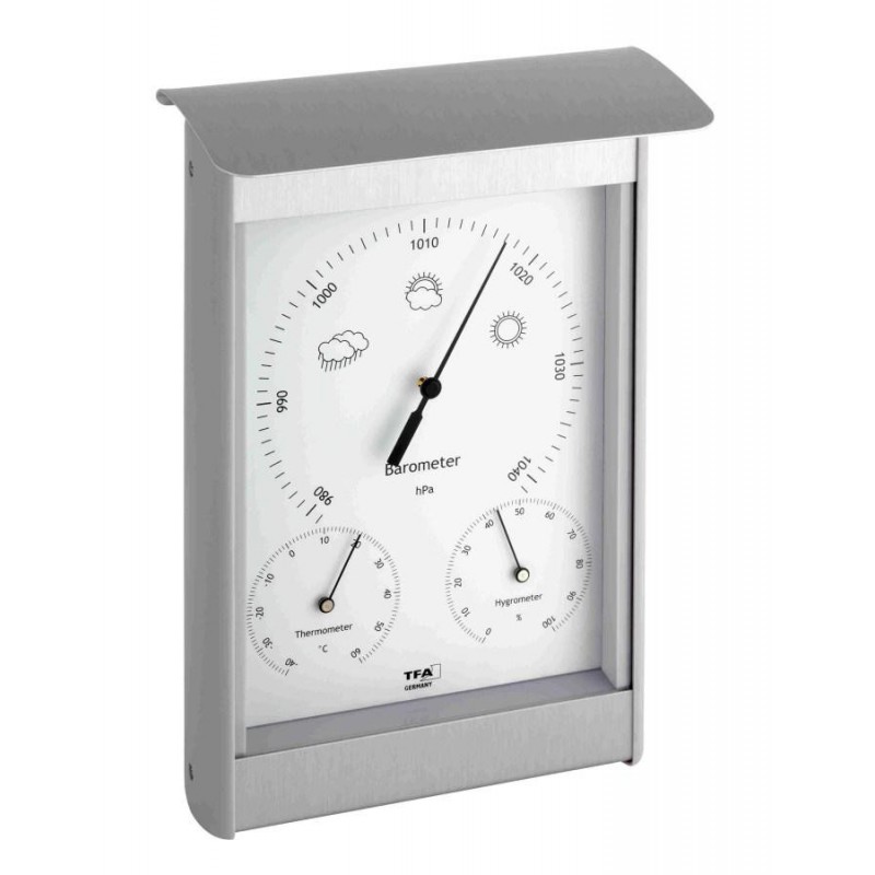 Analogová meteostanice vyrobená z hliníku/plastu informuje o aktuální teplotě a vlhkosti vzduchu a atmosférickém tlaku. Stanice je odolná vůči povětrnostním podmínkám, budíky jsou kryté sklem. Určeno pro zavěšení na zeď.