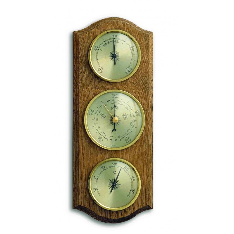 Meteostanice obsahuje barometr, vlhkoměr a teploměr - přístroje jsou o průměru 70 mm (teploměr, vlhkoměr) a 81 mm (barometr). Podložka je buková mořena do odstínu dubu.