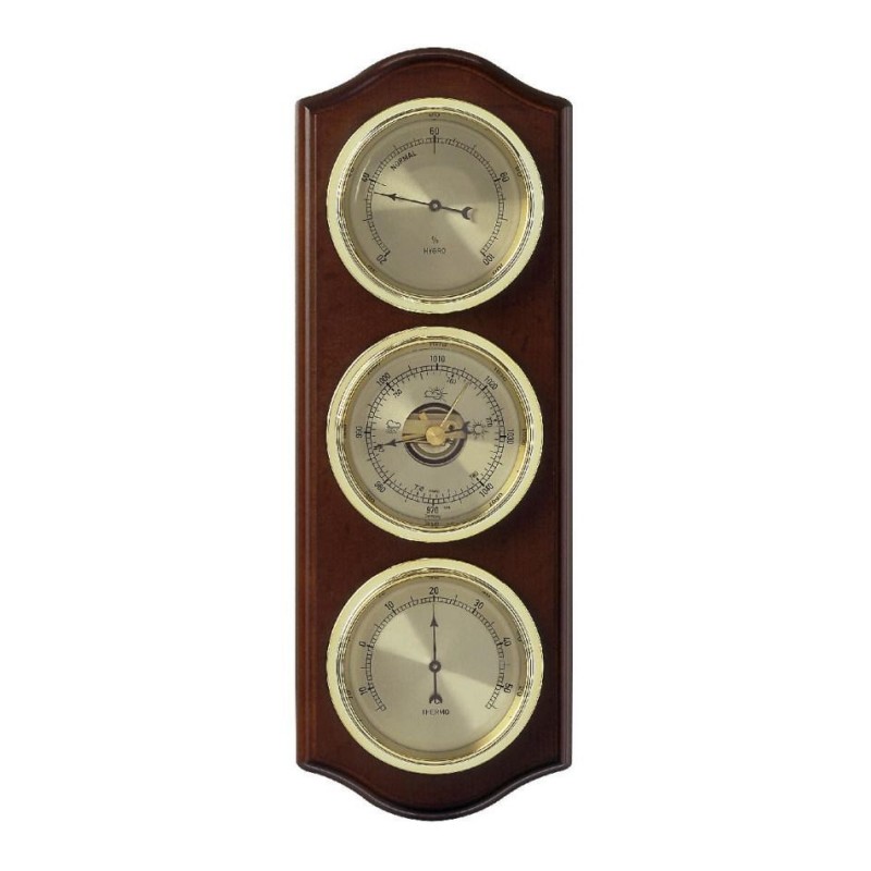 Meteostanice obsahuje barometr, vlhkoměr a teploměr - všechny přístroje jsou o průměru 93 mm. Podložka je buková mořena do odstínu ořechu.