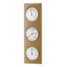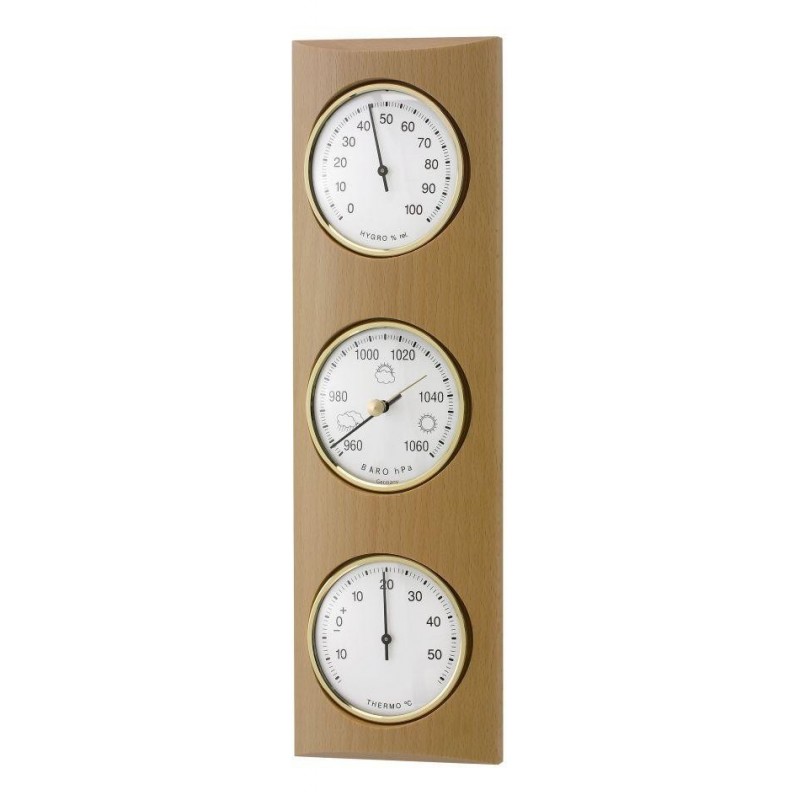 Meteostanice obsahuje barometr, vlhkoměr a teploměr - všechny přístroje jsou o průměru 81 mm. Jde o nástěnný model na podložce z masivu - buk, obroučky budíků ve zlaté barvě.