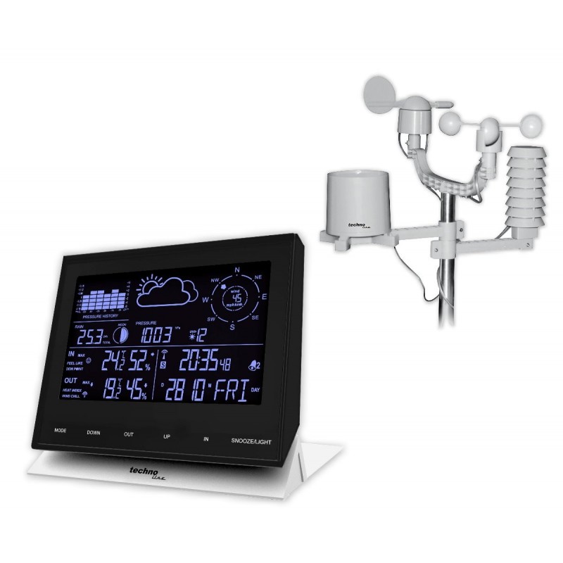 Meteorologická stanice s inverzním displejem. Měření vnitřní a vnější teploty, relativní vlhkosti, barometrického tlaku, rychlosti a směru větru, dešťových srážek, předpověď počasí