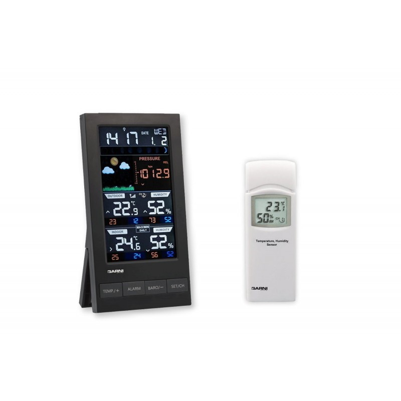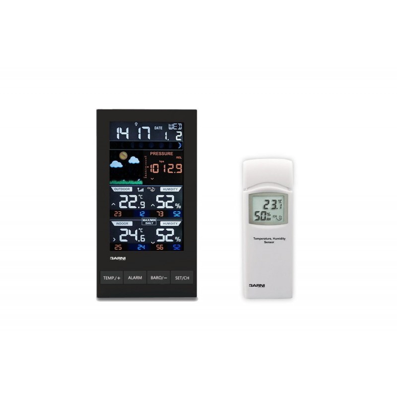 Meteorologická stanice s inverzním barevným displejem s časem řízeným rádiovým signálem DCF-77, budíkem, měřením barometrického tlaku, vnitřní teploty a relativní vlhkosti a bezdrátovým čidlem pro měření vnější teploty a relativní vlhkosti