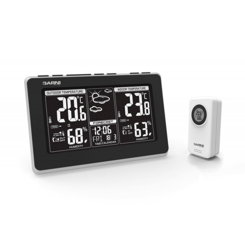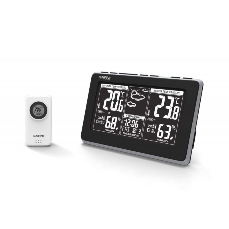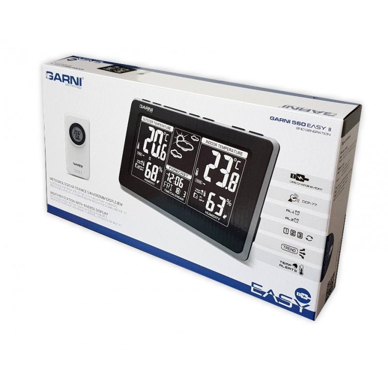 Meteorologická stanice s inverzním displejem s časem řízeným rádiovým signálem DCF-77, budíkem, měřením vnitřní teploty a relativní vlhkosti, bezdrátovým čidlem pro měření vnější teploty a relativní vlhkosti a USB portem pro napájení externích zařízení