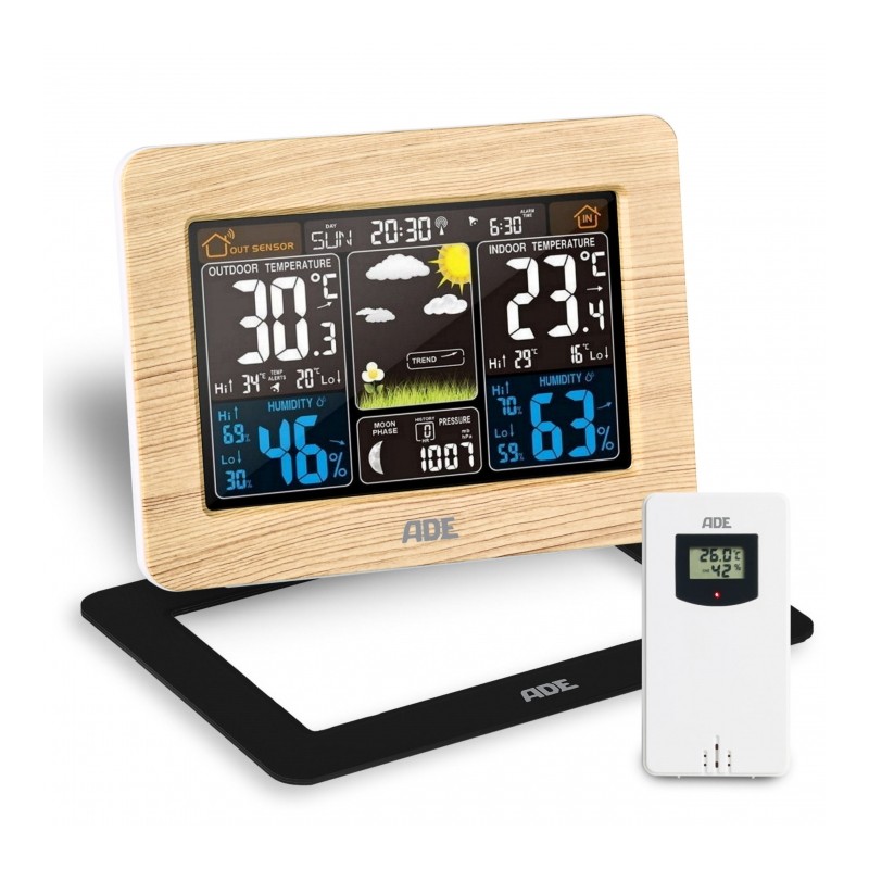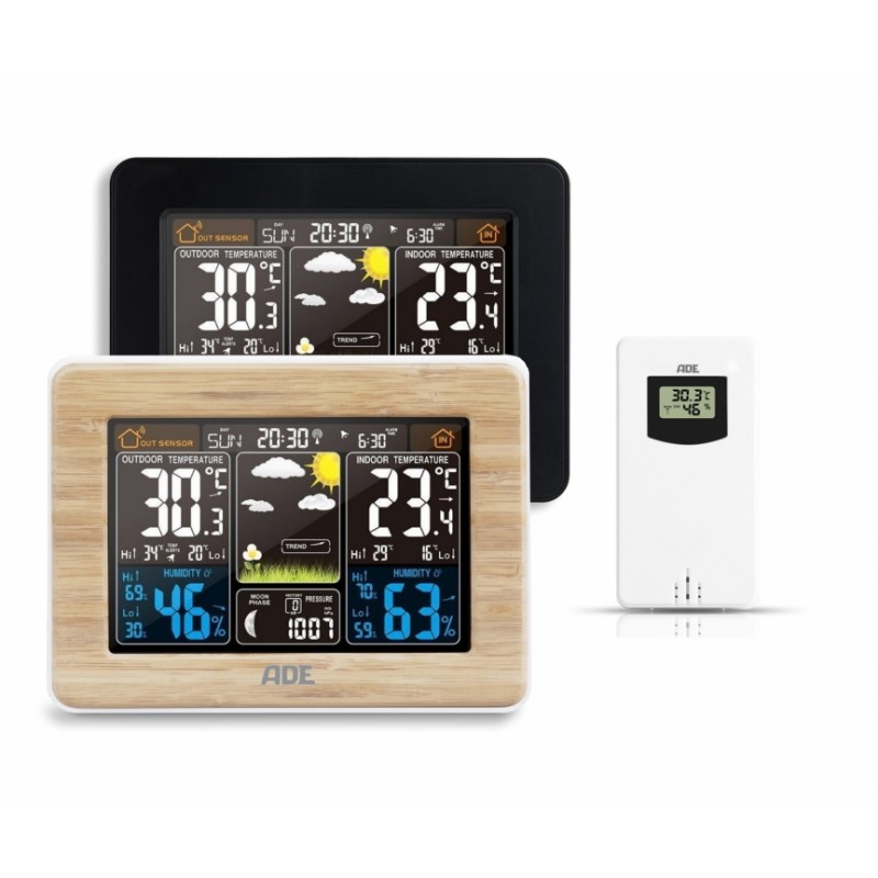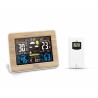 Meteorologická stanice s inverzním barevným LED displejem. Hlavní jednotka má na čelní straně rámeček se vzhledem bambusového dřeva s možností výměny za rámeček černý