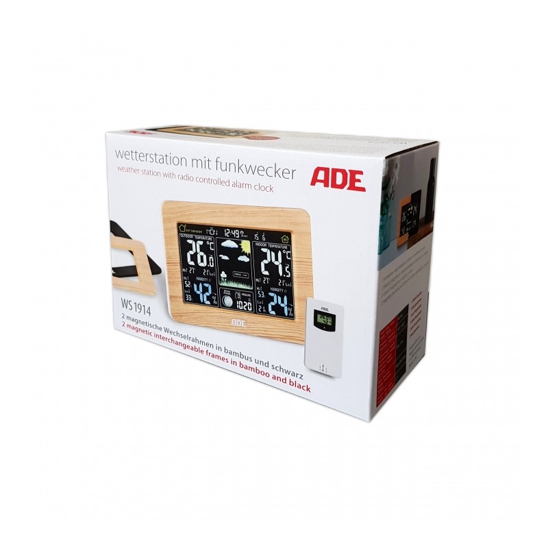 barevný inverzní LED displej 123 x 81 mm, stále osvětlený při napájení síťovým adaptérem, dva stupně jasu, možnost vypnutí, při napájení bateriemi možnost osvětlení displeje na 15 s barvy displeje: čas, datum, teplota, barometrický tlak, bílá, relativní vlhkost modrá čas 7 mm, zkr. názvu dne, datum 5 mm, teplota 24 mm, rel. vlhkost 20 mm, bar. tlak 8 mm, max a min hodnoty teploty a relativní vlhkosti 5,5 mm čas řízený rádiovým signálem DCF-77 možnost manuálního nastavení času 12ti, nebo 24 hodinový formát zobrazení času možnost nastavení časového pásma od -12 do +12 hodin budík s funkcí opakovaného buzení (Snooze) po 5 minutách buzení zvukovým signálem (10 sekund 1 pípnutí za sekundu, 10 sekund 2 pípnutí za sekundu,10 sekund 4 pípnutí za sekundu, poté stálé pípání) 7 ikon předpovědi počasí (slunečno, polojasno, oblačno, srážky, bouřky, sněžení, silné sněžení) šipky tendence vývoje barometrického tlaku, vnitřní teploty a relativní vlhkosti zobrazení absolutního barometrického tlaku v mb/hPa, inHg, nebo mmHg možnost zobrazení historie naměřených hodnot barometrického tlaku každou hodinu za uplynulých 12 hodin fáze Měsíce zobrazení hodnot vnitřní a vnější teploty a relativní vlhkosti možnost zobrazení teploty ve °F, nebo ve °C paměť na max a min naměřené hodnoty teploty a relativní vlhkosti, která se automaticky maže v 0:00 hodin alarm horní a dolní meze vnější teploty v rozsahu od -20°C do +70°C zvukovým signálem indikace možnosti námrazy od +3°C až -1°C ikonou na displeji a zvukovým signálem možnost připojení jednoho bezdrátového čidla, které je součástí balení bezdrátový přenos hodnot vnější teploty na frekvenci 433 MHz dosah až 60 m v otevřeném prostoru vyměnitelný čelní rámeček rozměry hlavní části 165 x 123 x 50 mm napájení síťovým adaptérem nebo bateriemi možnost postavení barva hlavní jednotky bílá s čelním rámečkem se vzhledem bambusového dřeva, nebo černým rámečkem Bezdrátové čidlo voděodolné provedení displej o rozměrech 19 x 11 mm měření vnější teploty a relativní vlhkosti možnost postavení, nebo zavěšení barva čidla bílá Obsah balení hlavní jednotka bezdrátové čidlo vyměnitelný rámeček 2 ks baterií typ AA 1,5V (tužkové) síťový adaptér 5 V, 600 mA český, slovenský, německý, anglický a francouzský návod