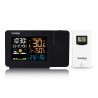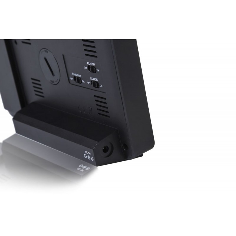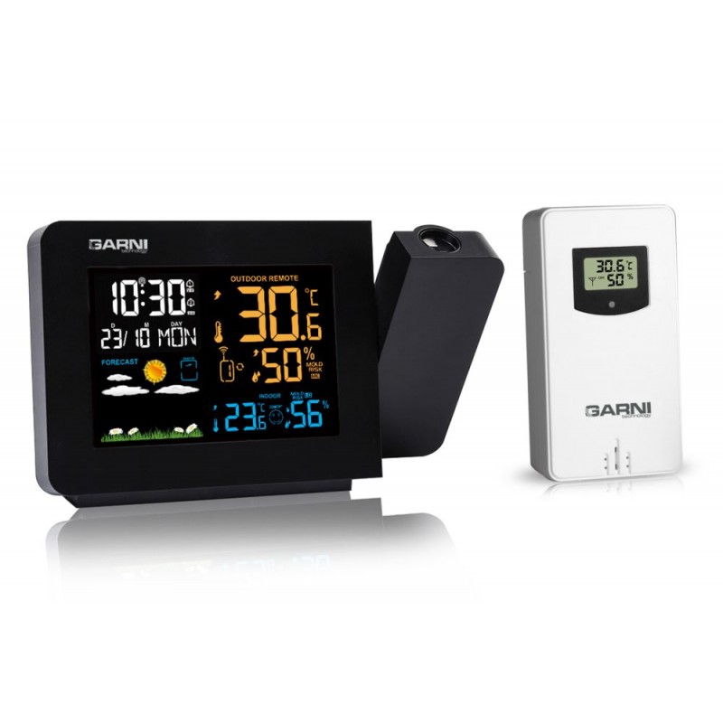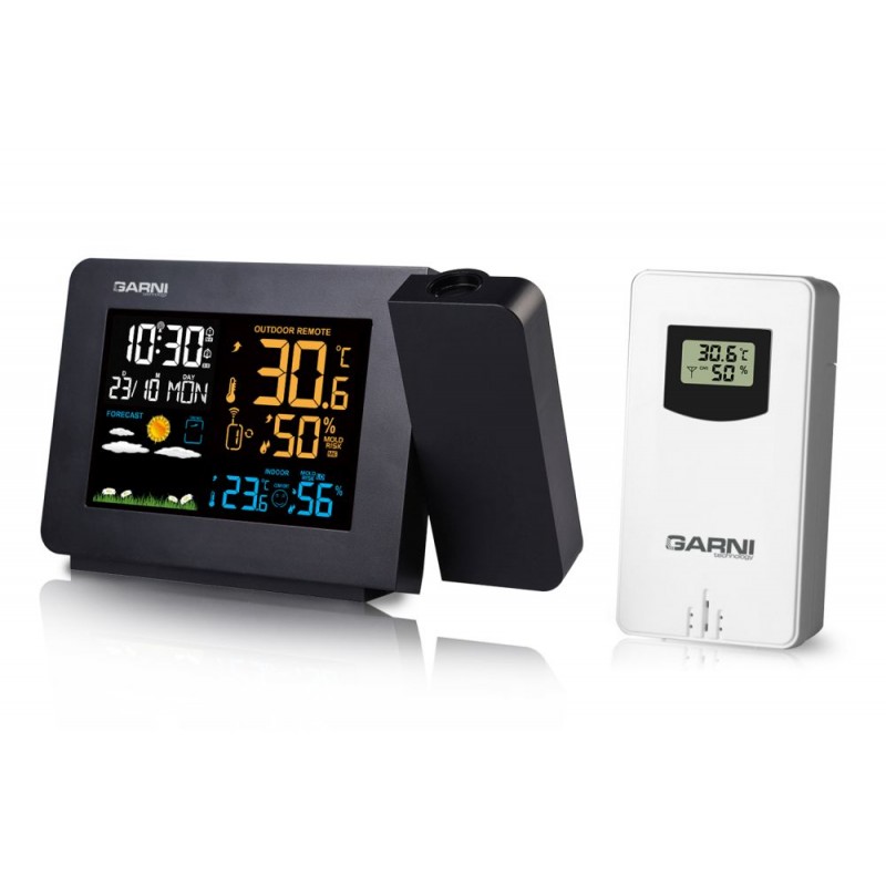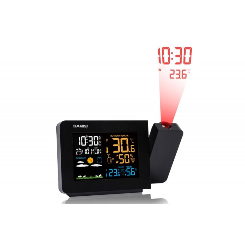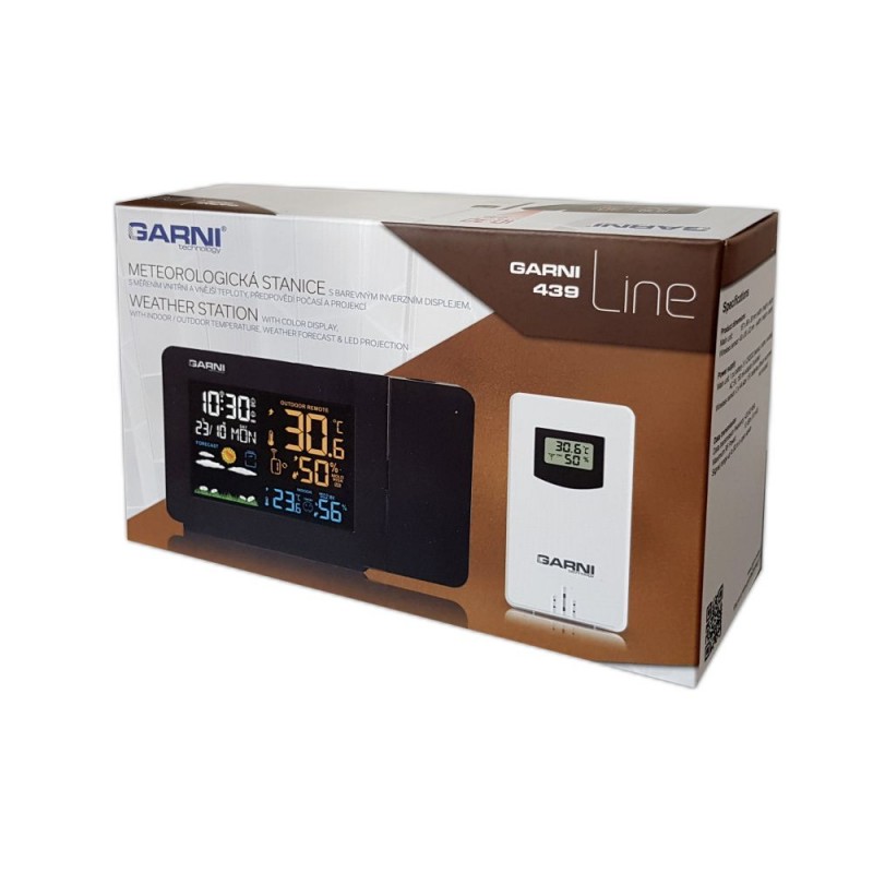 Meteorologická stanice se špičkovým inverzním barevným VA displejem s časem řízeným rádiovým signálem DCF-77, budíkem, měřením vnitřní teploty a relativní vlhkosti, bezdrátovým čidlem pro měření vnější teploty a relativní vlhkosti a projekcí času a vnitřní / venkovní teploty