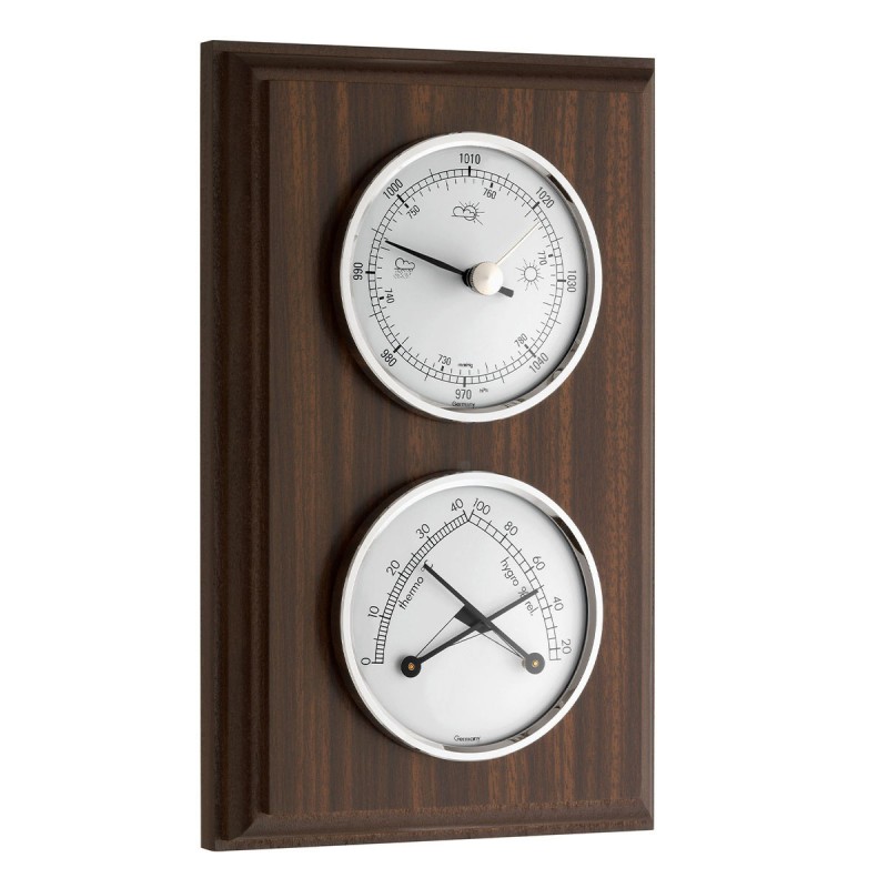 Meteostanice obsahuje barometr, vlhkoměr a teploměr - všechny přístroje jsou o průměru 70 mm. Jde o nástěnný model na podložce z dubového dřeva.
