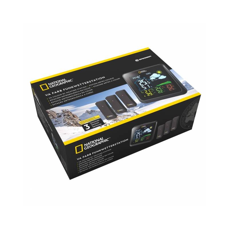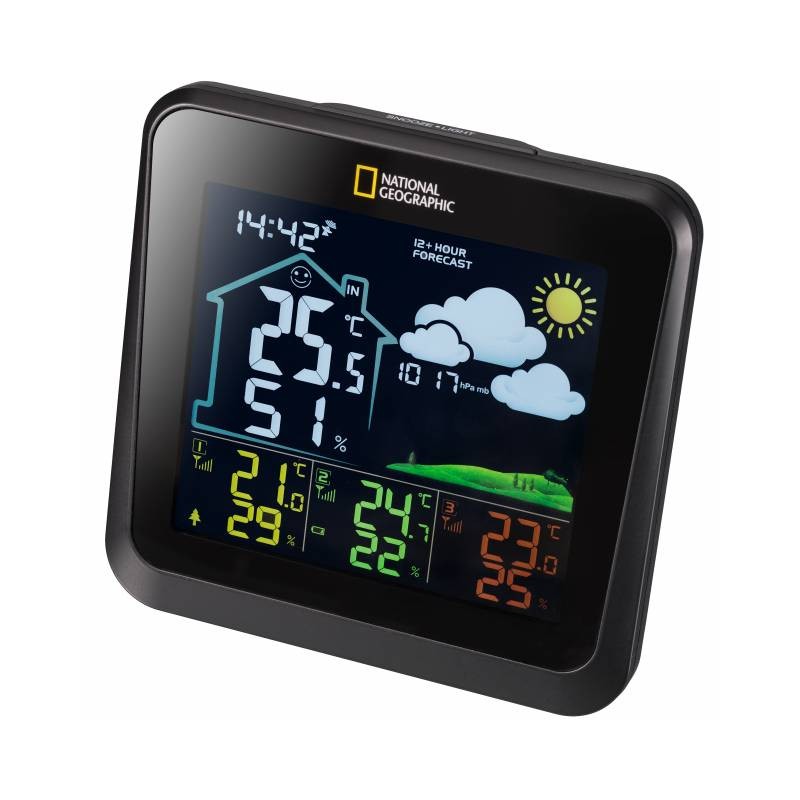 Barevná meteostanice NATIONAL GEOGRAPHIC VA se 4 místy měření v černé barvě zobrazuje všechny relevantní údaje o počasí na první pohled. Na přehledném barevném displeji najdete informace jako je teplota a vlhkost pro vnitřní i venkovní prostory a také přesný čas prostřednictvím rádiového přenosu DCF signálu. Kromě vestavěného senzoru v základně je stanice schopna přijímat údaje o teplotě a vlhkosti ze tří dalších senzorů, které jsou součástí této sady. Jejich použití je proto velmi všestranné, protože senzory lze umístit jak uvnitř, tak i venku. Jaká je teplota v dětském pokoji, je ve sklepě příliš vlhko, jaká je venku zima? Odpovědi na všechny tyto otázky lze zobrazit najednou na jednom displeji. Meteostanice zároveň zobrazuje aktuální hodnotu tlaku vzduchu a předpověď počasí na 12-24 hodin tvořenou právě na základě změn tlaku vzduchu.