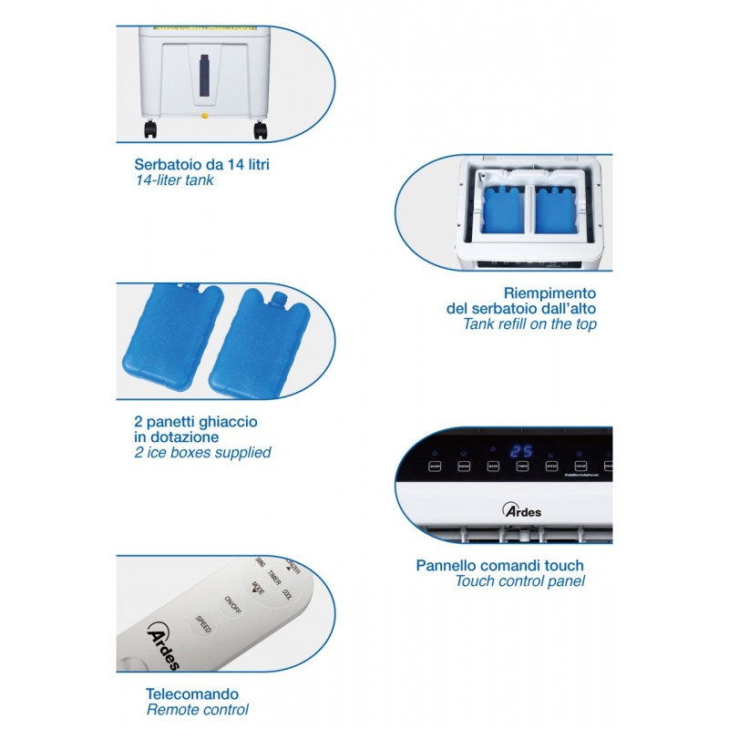 Mobilní chladící jednotka, zvlhčovač a čistička vzduchu v jednom, to je Ardes R14. Není potřeba žádné vývody jako u klimatizace - mobilní použití kdekoliv, ochlazovač pracuje na principu profukování vzduchu přes vodní filtry, kde se vzduch nasytí vodní párou a dojde k ochlazení vzduchu. Při přidání ledu do zásobníku dosáhneme vyššího výkonu ochlazení až o 3-5 °C, ochlazovač je vhodný všude tam, kde standardní ventilátory neposkytují dostatečné chlazení a klasická klimatizace není ekonomicky výhodnou alternativou.