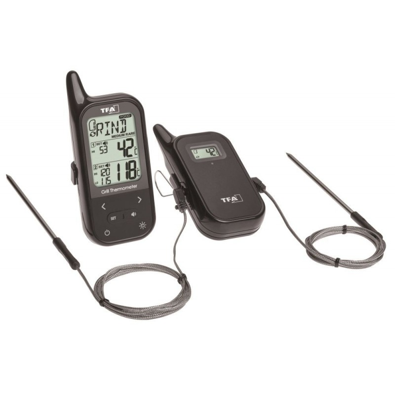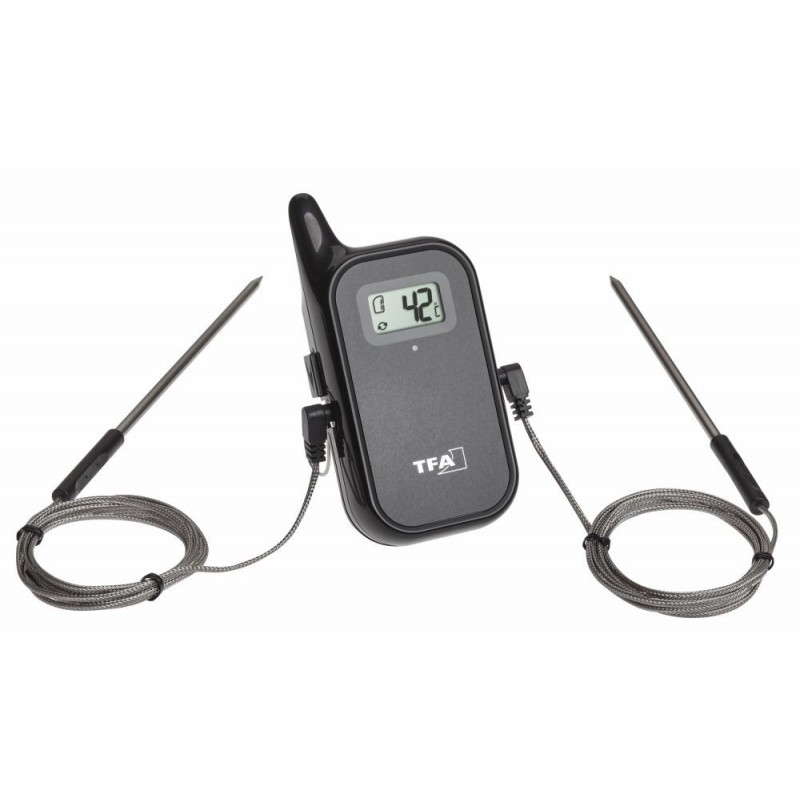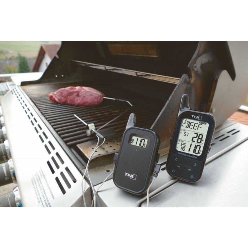 Jak dokolane připravit maso a drůbež? Pomocí kontroly teploty uprostřed masa! Vařte jako profesionál se 100% zárukou. Speciální funkce: bezdrátový grilovací teploměr TFA KÜCHEN-CHEF TWIN má dva snímače z nerezové oceli. Pomocí nich můžete sledovat teplotu v troubě nebo grilu pomocí nastavení horního a spodního teplotního limitu nebo kontrolovat teplotu přímo ve středu dvou kusů masa najednou. A navíc ani nemusíte být v kuchyni, naměřené hodnoty jsou totiž bezdrátově přenášeny z vysílače do základny přístroje. Můžete se tak věnovat sami sobě nebo svým hostům, zatímco se vaše maso připravuje k dokonalosti. A až bude teplota přesně podle vašich představ, teploměr vás upozorní zvukovou signalizací. Prostě - vařte jako šéfkuchař!