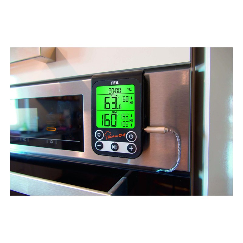 Digitální vpichový teploměr na maso TFA 14.1512.01 KÜCHEN-CHEF je určený pro kontrolu teploty masa při jeho přípravě. Pomocí vpichového čidla teploměr zjistí aktuální teplotu uvnitř masa a v jeho okolí. Díky nastavitelnému teplotnímu alarmu Vás upozorní, jakmile je maso dostatečně upečené. Teploměr lze postavit na rovnou podložku nebo upevnit na zeď pomocí magnetu umístěného na zadní straně.