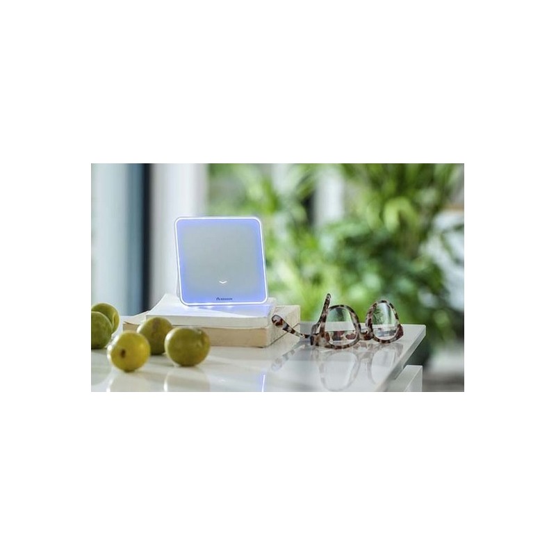 Po dotyku poskytuje barevně rozlišenou světelnou odezvu podél rámečku ve třech barvách podle kvality vzduchu: modrá (dobrá), oranžová (průměrná), červená (špatná).