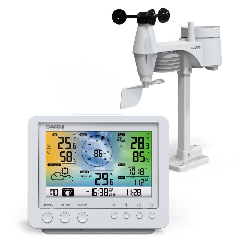 Wi-Fi meteorologická stanice s integrovaným bezdrátovým čidlem 5 v 1 model GARNI 975 je vybavena mnoha funkcemi zajišťujícími informace o předpovědi počasí. Integrované bezdrátové čidlo pracuje na frekvenci 868 MHz a měří teplotu, relativní vlhkost, rychlost a směr větru a dešťové srážky.