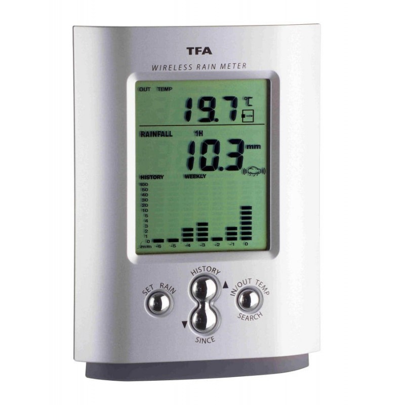 Tento rádiem řízený srážkoměr TFA 47.3003 s funkcí měření teploty je vysoce kvalitní měřící stanice pro monitorování srážek. Přístroj se skládá ze dvou hlavních částí – externí jednotky s měřícím prvkem na bázi lapače zachycujícího dešťové srážky s integrovaným venkovním teploměrem a vysílačem rádiových vln a ze základní stanice. Posledně jmenovaná část výrobku může být provozována jenom ve vnitřních prostorách. Základní stanice má velký LCD displej, kde se nezobrazuje jen hodnota objemu srážek a historie naměřených hodnot ve formě grafu, ale také venkovní a vnitřní teplota (možno přepínat mezi jednotkami stupňů Celsia a Fahrenheita, čas (případně datum) a údaje o předpokládaných trendech vývoje venkovní a vnitřní teploty.