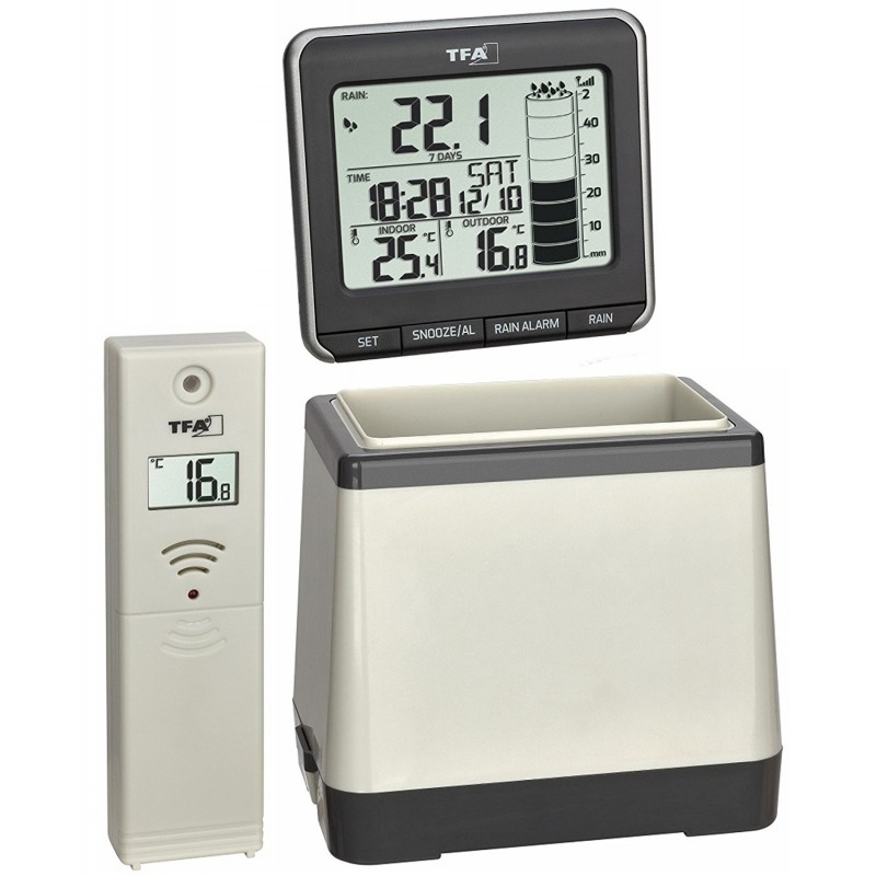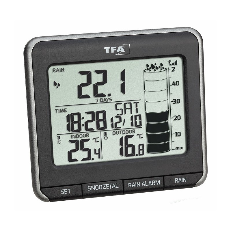 Bezdrátový srážkoměr TFA Rainman měří venkovní a vnitřní teplotu a srážky za posledních 24 hodin, 7 dnů, měsíc a celkový souhrn. Zároveň nabízí možnost prohlížení historie srážek za posledních 365 dnů, upozornění na déšť (24 hodin), budík s možností odložení buzení nebo čas a datum.