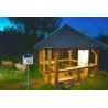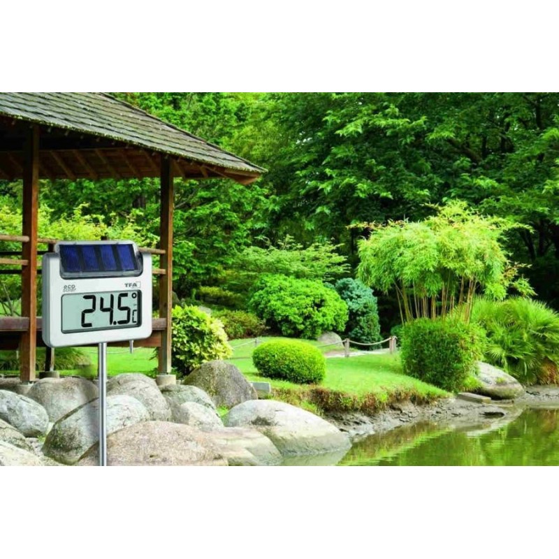 Zahradní teploměr se solárním článkem a velkým digitálním displejem, na kterém se zobrazuje aktuální teplota, nebo střídavě aktuální teplota a čas, případně aktuální teplota, naměřená maximální a minimální teplota a čas. Přístroj je napájen 1,5V AA baterií, která je součástí balení. Displej má možnost podsvětlení pomocí solárního panelu a dobíjecí baterie, která je rovněž součástí balení. Podsvícení displeje se automaticky aktivuje, jakmile se sešeří, nebo v době mezi 5. a 9. hodinou ráno a 18. a 23. hodinou večer. Na spodní straně je umístěno kovové teplotní čidlo. Teploměr je určen k zapíchnutí do země pomocí přiloženého stojanu, který se skládá ze tří šroubovacích částí.