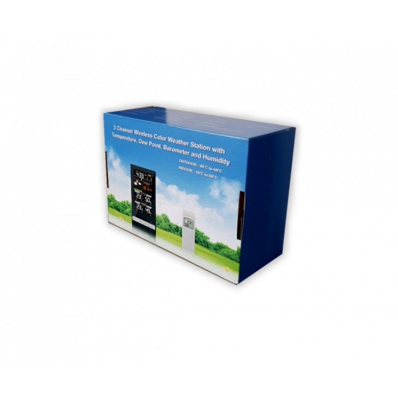 Meteorologická stanice s inverzním barevným displejem s časem řízeným rádiovým signálem DCF-77, budíkem, měřením barometrického tlaku, vnitřní teploty a relativní vlhkosti a bezdrátovým čidlem pro měření vnější teploty a relativní vlhkosti