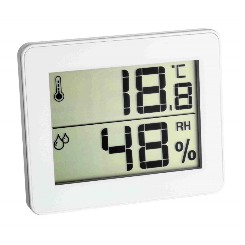 Digitální teploměr s vlhkoměrem TFA 30.5027.02 měří pokojovou teplotu v rozsahu 0 °C až +50 °C a pokojovou vlhkost v rozsahu 20-95 %. Displej je rozdělen na dvě poloviny, v horní je zobrazena teplota, v dolní části je zobrazena naměřená vlhkost. Kromě toho si přístroj pamatuje také naměřené min. a max. hodnoty, které si sám 1x za 24 hodin resetuje. Zařízení lze postavit na podložku nebo zavěsit na zeď.
