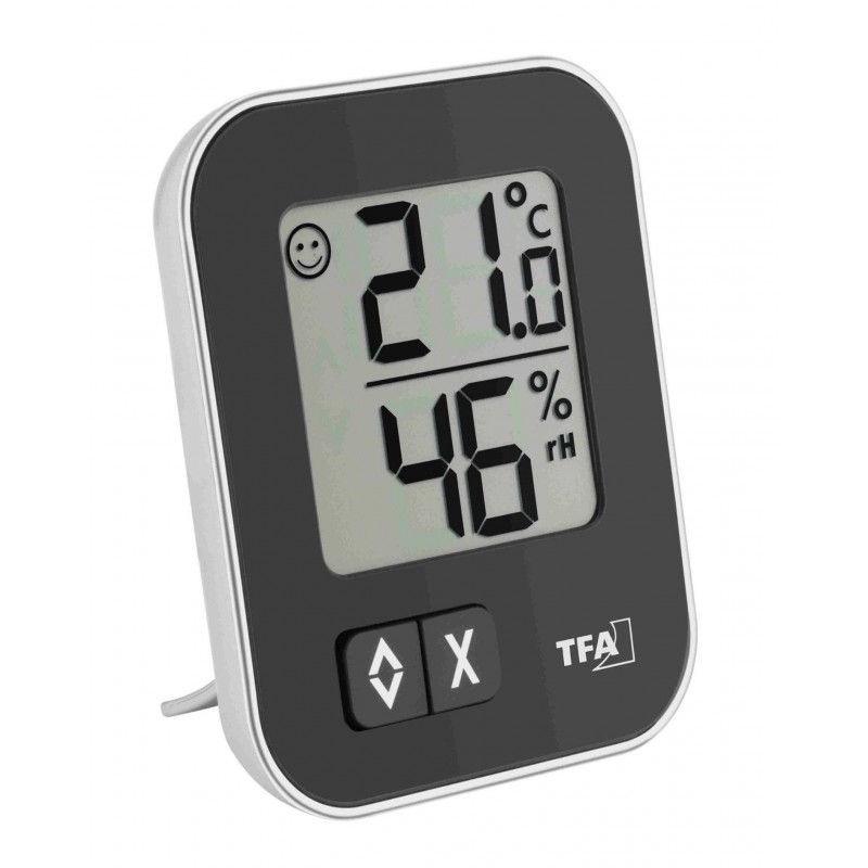 Digitální teploměr s vlhkoměrem TFA 30.5026.01 MOXX měří pokojovou teplotu v rozsahu 0 °C až +50 °C a pokojovou vlhkost v rozsahu 20-99 %. Přístroj si také pamatuje naměřené min/max hodnoty. Na displeji je také symbol komfortu - smajlík zobrazuje správné klima v místnosti (40% - 60%). Teploměr je možno zavěsit na stěnu, nebo opřít o výklopný stojánek.